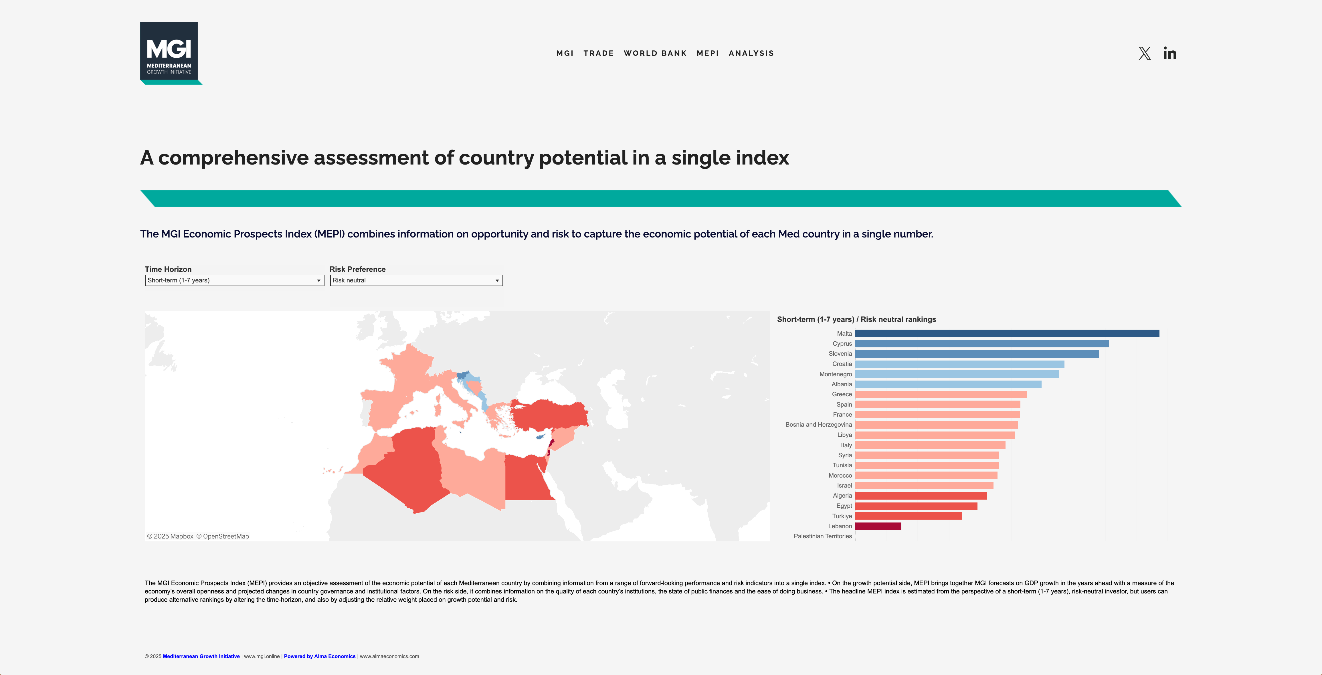 A comprehensive data platform bringing together and visualising key economic and demographic data for countries in the Mediterranean region, including benchmarking, forecasting and bespoke analysis.